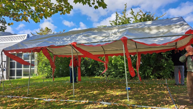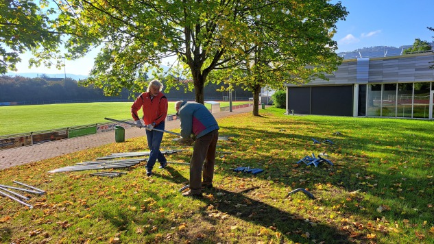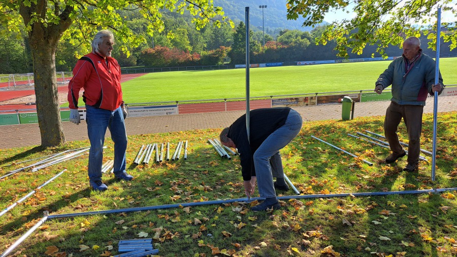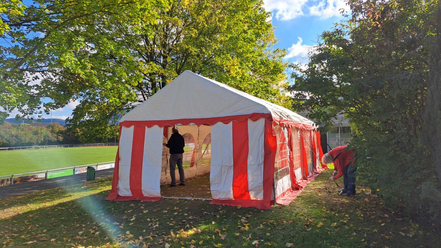 In einem sehr konstruktiven Gespräch mit dem damaligen Bürgermeister Bernd Rößner, im September 2022, erhielt eine neue Abteilungsleitung die Zusage, das Zelt temporär aufstellen zu dürfen. Den zeitlichen Aufwand für Auf- und Abbau scheuend, tat sich jedoch weitere 3 Jahre nichts. Doch dann ging es Schlag auf Schlag. Am Montag, 29.09.25, wurde der FTSV kurzfristig beauftragt, am folgenden Wochenende einen Kinderspieltag für Bambini- und F-Jugend-Mannschaften auszurichten. Wegen der schlechten Wetterprognosen fasste man den Aufbau des Zeltes ins Auge. Auf kurzem Wege genehmigte die Gemeindeverwaltung die Nutzung und am Donnerstag, 02.10.25, machten sich 4 engagierte Rentner von „Aktiv und Fit“ daran, das Zelt aus seinem Verlies zu holen und endlich seiner ursprünglich vorgesehenen Bestimmung zuzuführen.