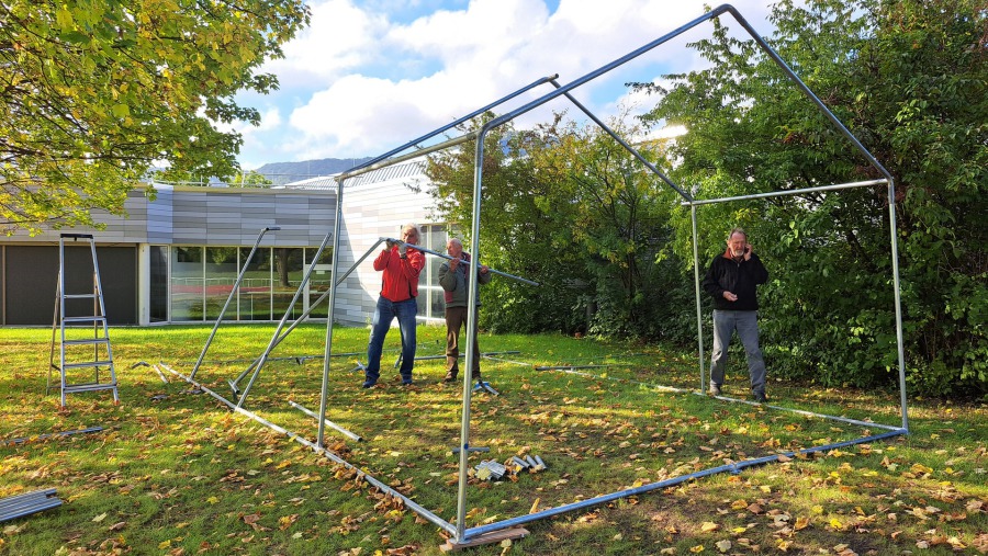 Der Hersteller setzt für den Aufbau 1,5 Stunden an. Leider lagerten die 322 Einzelteile der Zeltkonstruktion nicht mehr in ihren ursprünglichen und übersichtlichen Verpackungen. Die Rohre des Stahlgestänges, Verbindungs- und Verschraubungselemente, Planen, Abspannseile, Gummischlaufen, Schrauben und Muttern lagen in einer stabilen Holzkiste bunt durcheinander. Eine Aufbauanleitung fand sich leider auch nicht mehr.